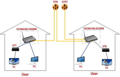 Overview        GDONU300-2030BW is FTTH slaver combined GPON ONU and CATV optical receiver in one box. GDONU300-2030BW series are optical network terminal targeting FTTH networking strategy. GDONU300-2030BW includes a variety of models covering GPON SFU data type and double optical fiber type. The double optical fiber type is composed of CATV optical receiver and ONU; CATV optical receiver has the feature of low optical power receiving while ONU adopts compatible chips with GPON. In all, this series is well positioned to fulfill different FTTH networking requirement, providing reliable and secure service that come in all varieties. Features              ONU :